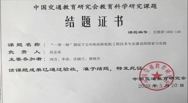 结业证书-一带一路”倡议下五年制高职轮机工程技术专业建设的探索与实践