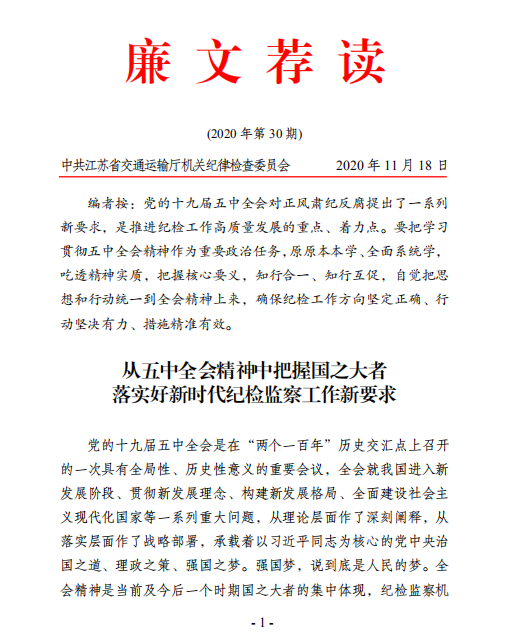 廉文荐读第30期——从五中全会精神中把握国之大者 落实好新时代纪检监察工作新要求