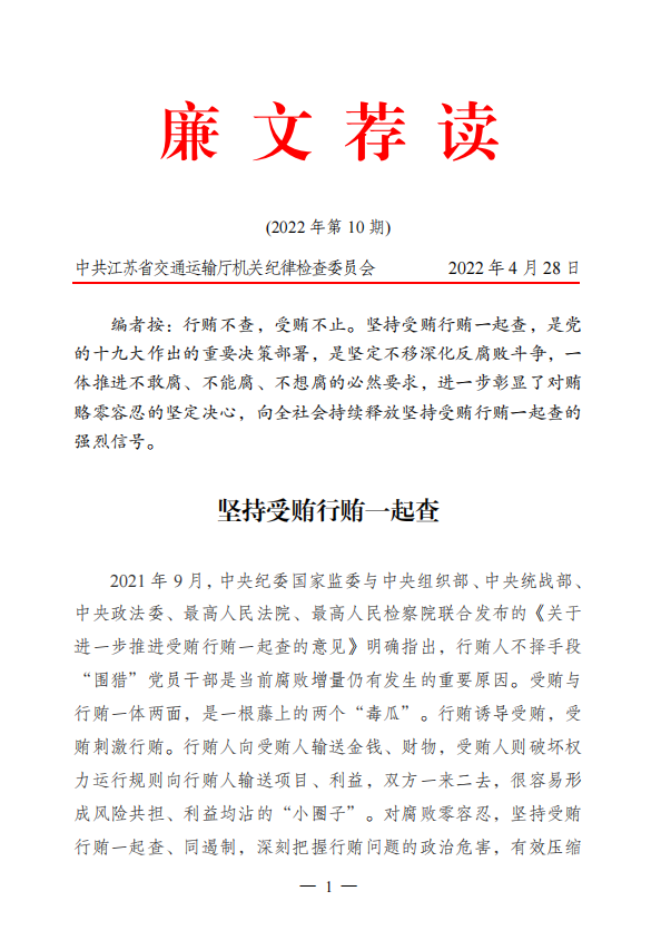 2022年廉文荐读第10期——坚持受贿行贿一起查