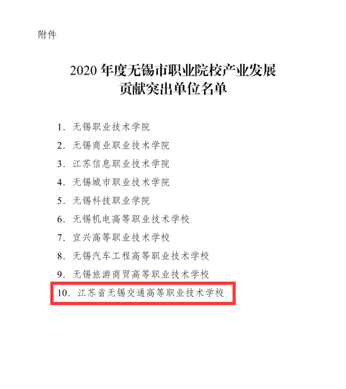128日,无锡市教育局发布了《关于公布无锡市职业院校促进产业发展贡献突出单位名单的通知》(锡教发〔2020101号),我校获评2020年度无锡市职业院校促进产业发展贡献突出单位。