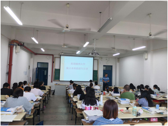 为进一步增强我校学生对扬州大学专接本独立本科段学习的认识,拓宽学生的升学渠道,6月5号上午扬州大学焦胜利主任一行来我校进行宣讲。