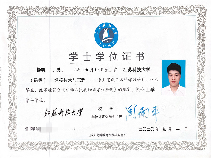 江苏科技大学学士学位证书