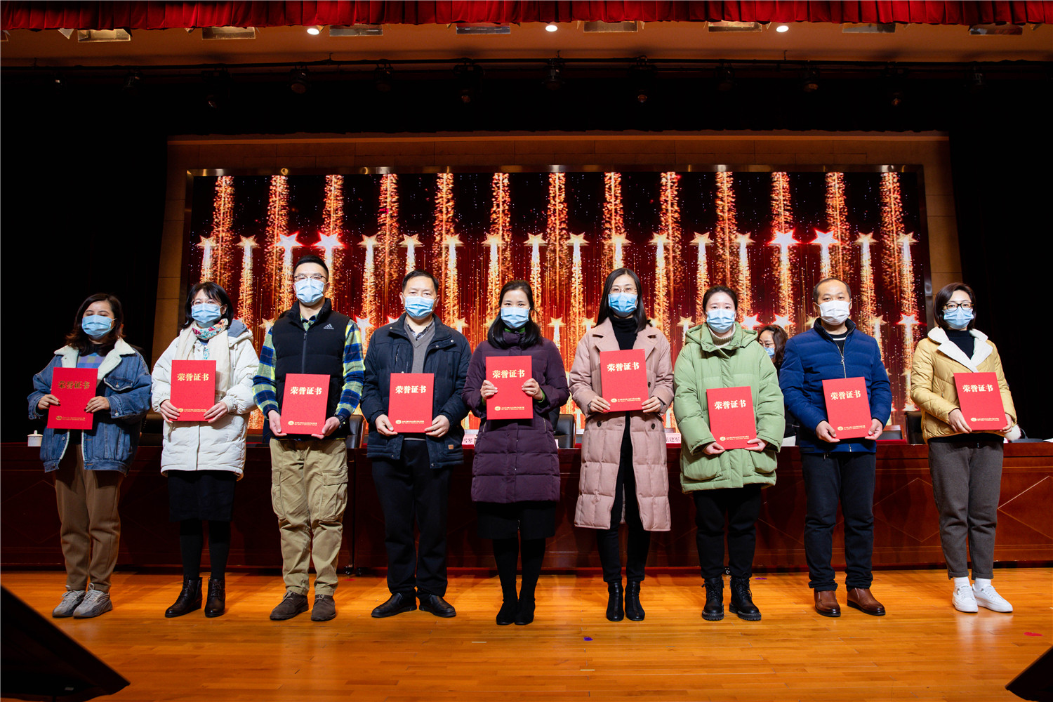 学校党委副书记、纪委书记朱雨兰宣读了学校“2020年十件大事”。学校副校长邢勇宣读《关于表彰学校2020年师德师风先进集体、师德师风先进个人的决定,副校长倪依纯宣读2020年教职工获奖情况通报。会上,校领导为获奖集体和个人颁发荣誉证书。