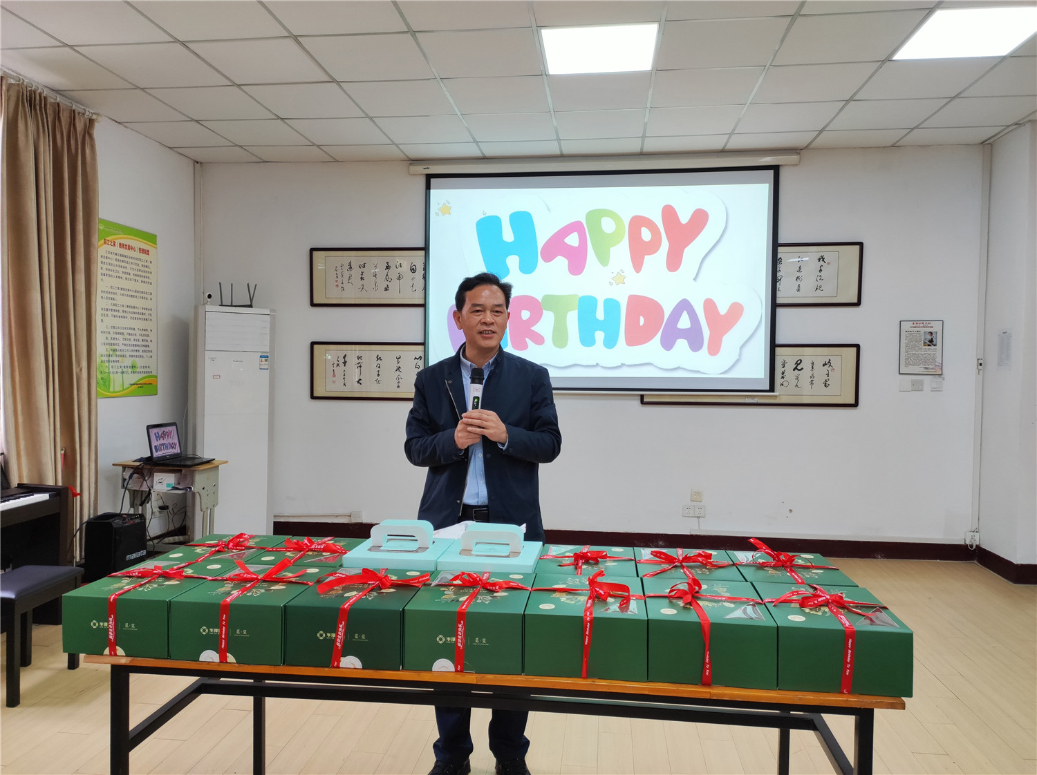 会上,行政二分工会主席巢建军也为寿星们送上祝福。基础教学音乐教师周琪为大家献歌一首,陪着母亲坚守岗位的成玲老师的女儿,主动为寿星们唱生日歌!现场其乐融融。