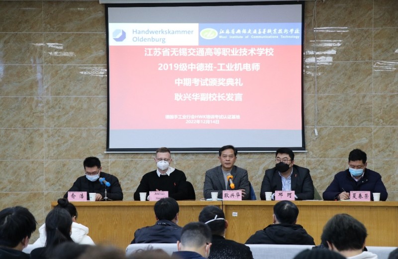 为进一步开展好德国手工业行会工业机电师培养项目,不断总结经验和成果,激励同学们将更多的精力投入到项目学习中,机电工程学院与德国手工业行会中国项目办于12月14日下午,在锡澄校区举行了2019级工业机电师中期考试颁奖典礼。学校党委委员、副校长耿兴华,德国手工业行会中国项目办总负责人邓珂博士、机电工程学院院长夏春荣、德国手工业行会教官Andreas Meyer、学院优秀教师、家长代表、全体2019级中德班学生等参加了本次颁奖典礼,会议由机电工程学院副院长俞浩主持。
