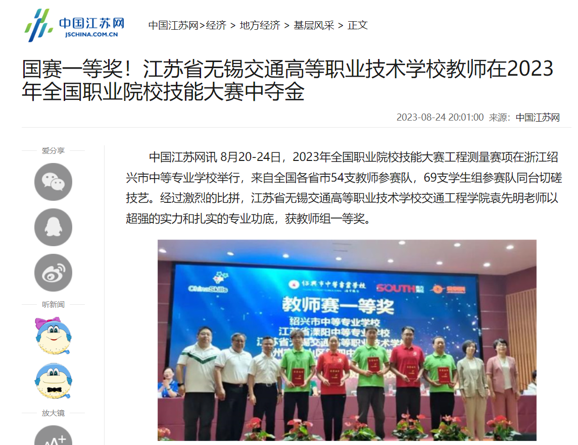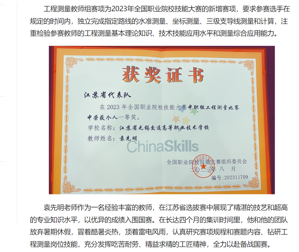 江苏交通:无锡交校教师获全国职业院校技能大赛工程测量赛项一等奖