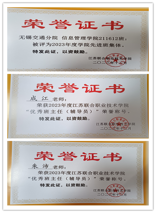 近日,江苏联合职业技术学院发布通知,表彰2023年度先进班集体、优秀班主任(辅导员)。信息管理学院211612班、班主任成江、朱沛获2023年度联合学院“先进班集体”、“优秀班主任(辅导员)”荣誉称号。