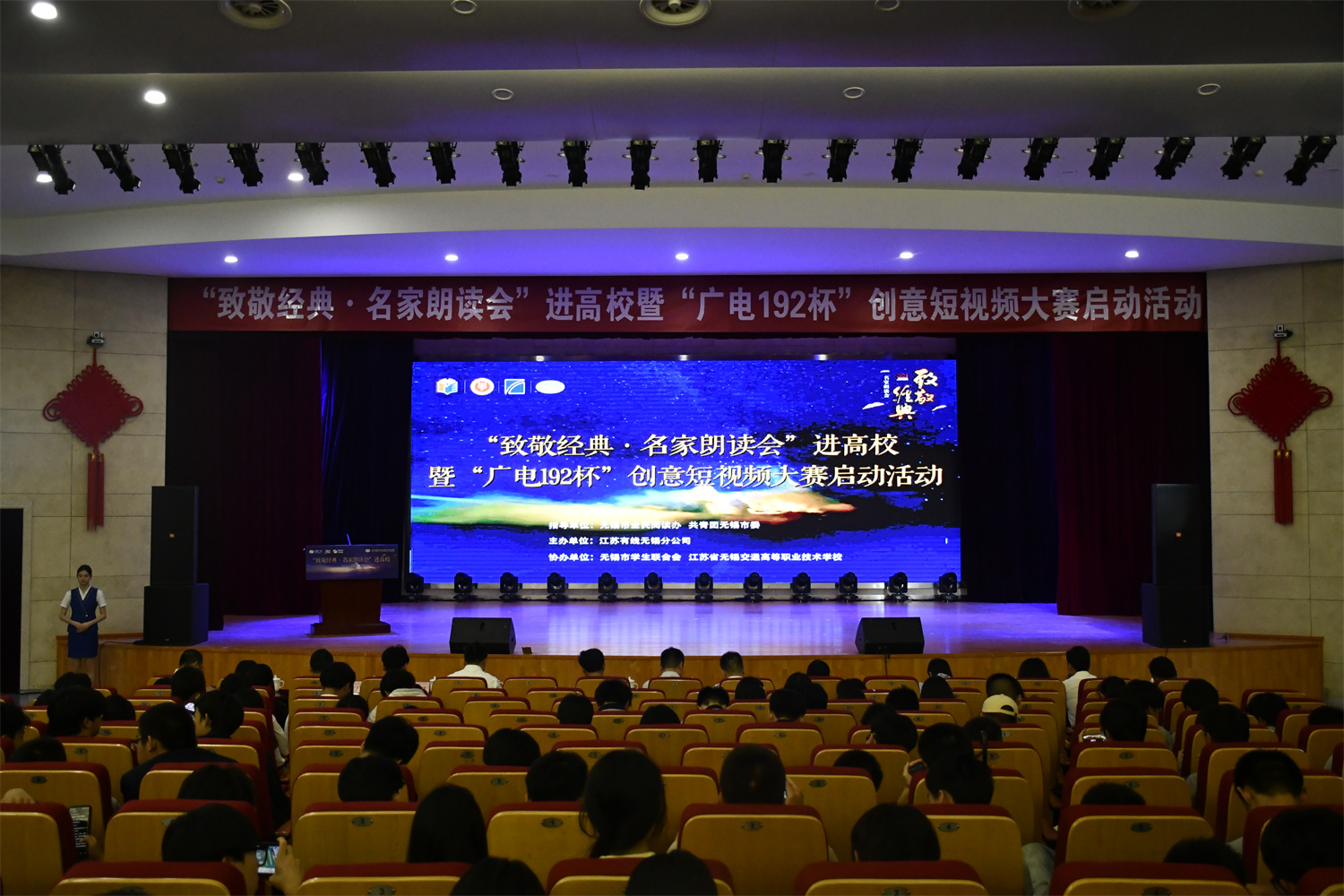 6月5日下午,一场别开生面的文化盛宴在学校大礼堂拉开帷幕。由江苏有线无锡分公司主办,无锡市学生联合会、必一体育·(中国)官方网站联合承办的“致敬经典·名家朗读会”进高校暨“广电192杯”创意短视频大赛启动活动在此成功举办。无锡市委宣传部出版印刷发行处副处长冯健,共青团无锡市委学少部副部长王裔,江苏有线无锡分公司党委委员、副总经理赵晓光,校党委委员、副校长耿兴华、王珏及在锡高校领导代表、江苏有线无锡分公司代表、我校师生代表600余人共同参加了本次活动。