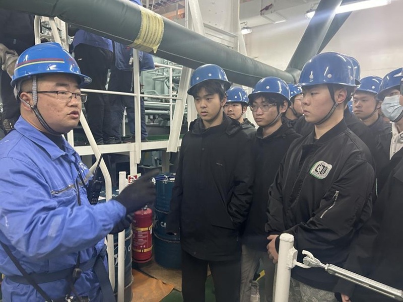 在企业专家的带领下,我校师生首先参观了厂区船坞、船台及各个车间,直观学习到了各个船舶分段,并了解目前企业主要在建船型,使学生深刻学习到了造船流程。随后,学生们登上了一艘5万吨成品油船,参观了机舱、甲板、驾驶台等区域。企业专家非常细致地给学生讲解了主机、发电机、锅炉、制冷装置、轴系等重要的机舱设备,并介绍了部分技术非常先进的新设备,让学生学习到了很多在课堂中难以获取的新知识,拓宽了专业知识面。最后,企业专家为我校师生介绍了扬子江集团的企业文化、已建造的典型船舶、企业发展愿景等。企业方表示,后续将进一步加强和我校的合作,共育高素质船业人才。
