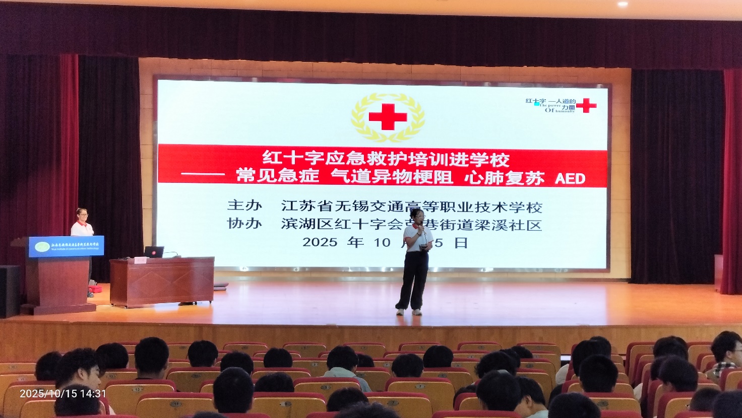 10月15日,汽车工程学院在学校大礼堂举办了一场意义非凡的红十字应急救护培训。学院联合滨湖区红十字会荣巷街道梁溪社区特别邀请无锡市红十字会四星救护培训师蒋小燕老师,为学生们带来实用急救知识与技能。