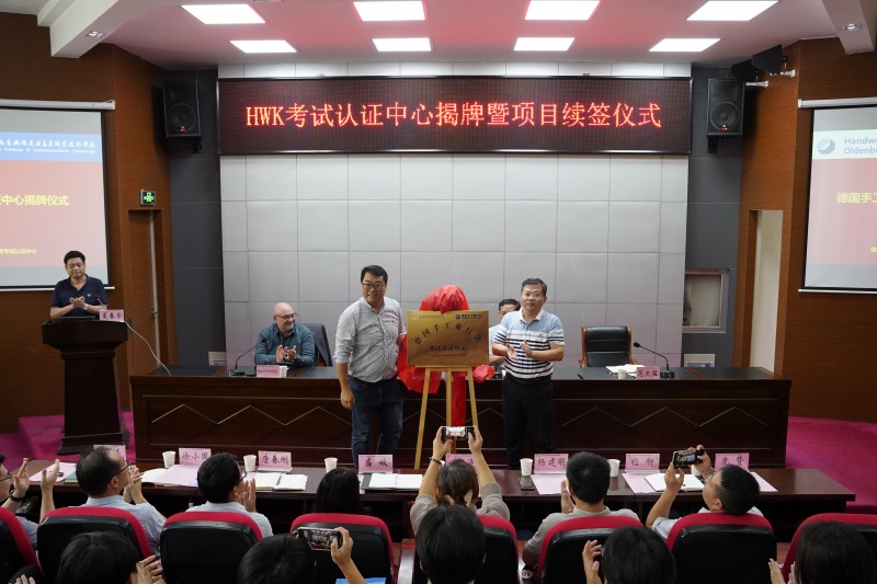 仪式首先介绍了双方领导及议程,随后进行了德国手工业行会无锡考试认证中心的揭牌仪式,标志着双方合作迈入新阶段。紧接着,双方签署了中德工业机电师合作项目的续签协议,进一步巩固了双方在教育领域的合作关系。