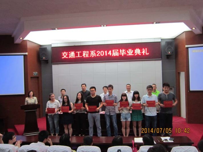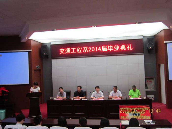 2014年7月5日上午,交通工程系2014届毕业生毕业典礼在我校学术报告厅隆重举行,出席本次毕业典礼的有学校校长陆春其老师、教务处副处长邢木清老师、学生工作处副处长王演新老师、交通工程系主任陈建明老师、副主任邹定南老师以及交通工程系全体教师和系部2014届全体毕业生。