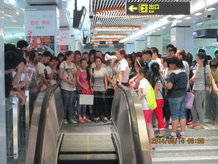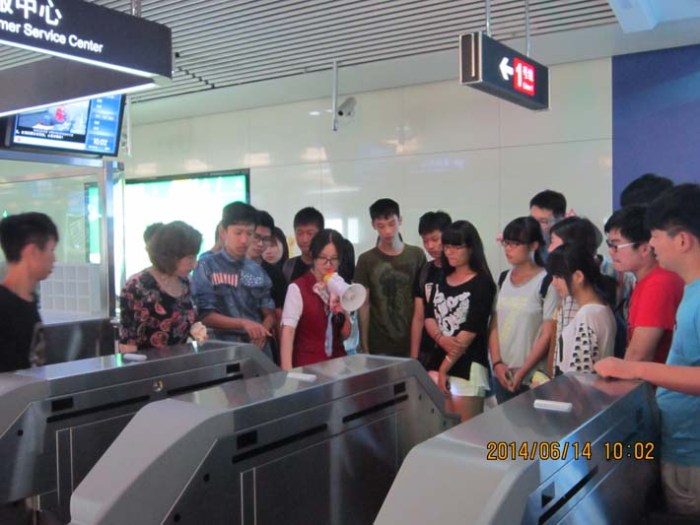 2014年6月14日早上9:30,交通工程系32名暑期地铁志愿者在系部毛兰霞书记和朱珂玮老师带领下,前往无锡地铁一号线太湖广场站进行岗前培训。地铁工作人员带领学生参观车站的站厅和站台,对同学们详细说明志愿者的工作内容和注意事项,同学们认真听讲并做了笔记。在地铁工作人员的详细讲解下,32名同学逐一认识了各种轨道设备,并了解了如何去使用它们。