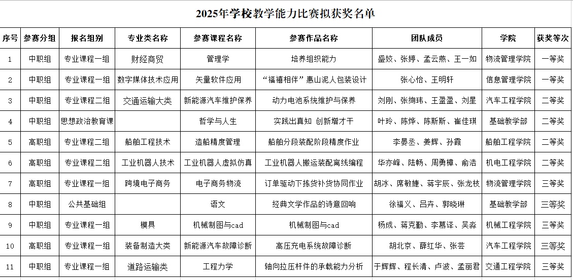根据学校《关于举办2025年教师教学能力比赛的通知》,学校启动了2025年教学能力比赛评比工作,共收到各院部的推荐作品15个。教务处聘请并组织专家对参赛作品进行了评审,拟确定《培养组织能力》等2个参赛作品为一等奖,《动力电池系统维护与保养》等4个参赛作品为二等奖,《订单驱动下拣货补货协同作业》等5个参赛作品为三等奖,现予以公示。