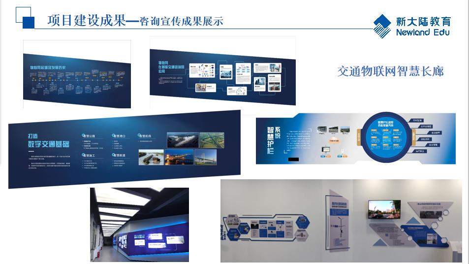 实训基地严格按照建设方案组织建设,精心施工,精益求精,追求卓越,已建成物联网关键技术实训室、智慧物流实训室、物联网综合应用实训室、智能交通实训室以及交通物联网技术综合展厅。综合展厅主要由开启智慧之路(综合可视化平台)、智融科技全数前行(智慧物流)、智控互联跨界融合(识别系统、智慧出行畅想生活(五峰山智慧大桥)、智能物联 创造无限(智慧路口)、智融智联智控慧行(智能快递)、智慧城市(交通大沙盘)、智慧护栏、智慧灯杆、文化长廊等部分组成,实训基地整体氛围极具现代科技感。
