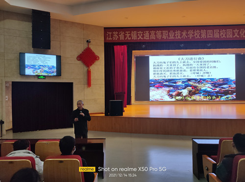 为教育引导团学干部铭记历史,振奋民族精神,加强青年学生的爱国主义教育,1214日下午,学校邀请了无锡市关工委报告团蒋川海老师,在学校礼堂面向团学干部开展了“铭记历史 开创未来”的主题讲座,全体在校班级班团干部、学生会干部和各社团负责人共200余人参加了此次活动。