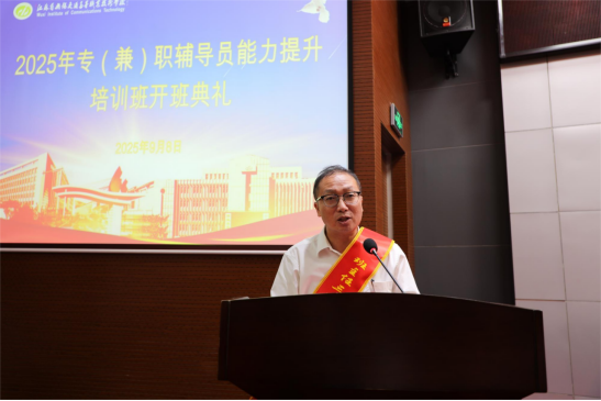 为全面提升学生工作队伍的业务能力和综合素养,帮助专(兼)职辅导员更好地适应新时代学生工作的新要求,9月8日至9日,学校成功举办了2025年专(兼)职辅导员能力提升培训班。学校党委委员、副校长吴雪琴出席开班典礼,各二级学院分管学生工作的领导、学工办主任、学工干事、2025级新生班专(兼)职辅导员80余人参训。开班典礼由学生工作处处长、团委书记王光祥主持。
