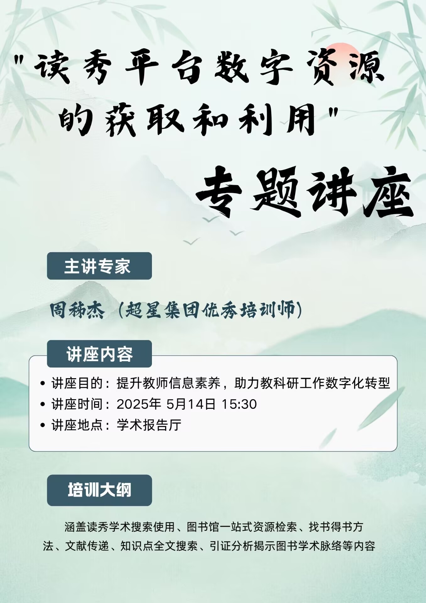 为深化数字资源服务效能,提升师生信息素养水平,5月14日下午,学校图文信息中心在学术报告厅成功举办“读秀平台数字资源的获取和利用”专题培训讲座。本次讲座由图文信息中心副主任巫海平主持,特邀超星集团南京分公司周秭杰讲师担任主讲嘉宾,来自各院部的专任教师、科研骨干及学生代表共计150余人参与学习。